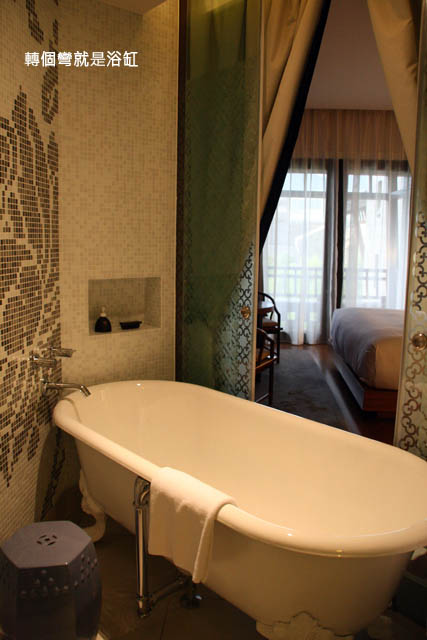 悅椿的住房雖然空間沒有悅榕庄大,但是小歸小,還是間間有陽台,可以倚在女兒靠上眺望園區造景,而房內的浴缸也備有浴鹽,忍不住就想泡澡自拍。